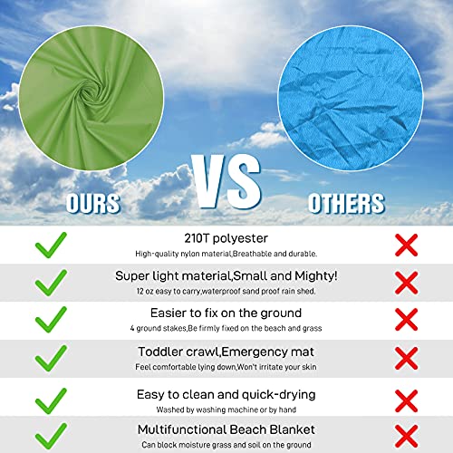 - 🏖️Beach Blanket Waterproof Sandproof:78''×81'' Size beach blanket comfortable fit 4-7 adults,Odorless,Made by parachute fabric,Rip-stop 210T polyester,Very light and small after folding,12 oz easy to carry,Small and Mighty!