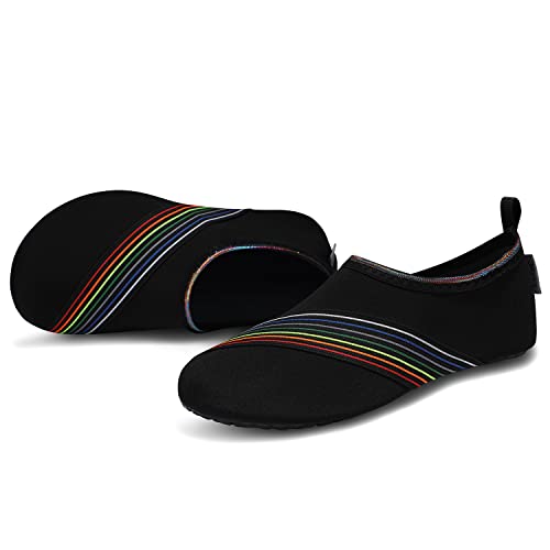Made with soft material, 92% polyester+8% spandex Upper, these water socks have breathable ultra light fabrics with fine stretch on uppers. A smooth-designed neck prevents chafing and slipping off when wearing these funny water shoes.