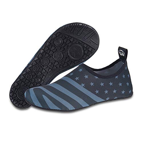Made with soft material, 92% polyester+8% spandex Upper, these water socks have breathable ultra light fabrics with fine stretch on uppers. A smooth-designed neck prevents chafing and slipping off when wearing these funny water shoes.
