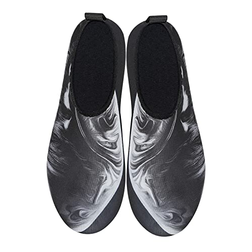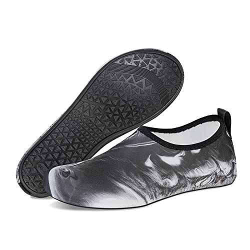 Made with soft material, 92% polyester+8% spandex Upper, these water socks have breathable ultra light fabrics with fine stretch on uppers. A smooth-designed neck prevents chafing and slipping off when wearing these funny water shoes.